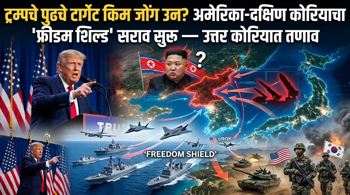 एकीकडे मध्यपूर्वेत अमेरिका आणि इराण यांच्यातील संघर्ष धगधगत असतानाच आता पूर्व आशियामध्येही तणावाचे ढग जमा होऊ लागले आहेत. अमेरिका आणि दक्षिण कोरियाने त्यांचा सर्वात मोठा वार्षिक संयुक्त लष्करी सराव ‘फ्रीडम शिल्ड’ आजपासून सुरू केला आहे. या हालचालींमुळे उत्तर कोरियाचा हुकुमशहा किम जोंग उन चिडण्याची आणि नवीन क्षेपणास्त्र चाचणी करण्याची शक्यता संरक्षण तज्ज्ञांनी व्यक्त केली आहे